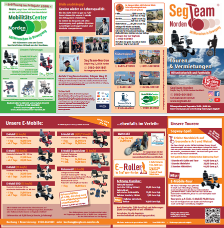 Hier im Mobilitätscenter-Norden und als „Tochter“ vom bekannten SegTeam-Norden, stehen wir euch mit Rat und Tat in Sachen Hilfsmitteln zur Seite. „Das Gleiche in grün“ bietet euch ebenfalls das komplette Angebot für Mobilität. Seniorenscooter, E-Mobile, Krankenfahrstühle, Rollstühle (auch elektrisch oder mit Schiebehilfe), Rollatoren (auch elektrisch), so wie Segways und E-Roller stehen bereit, um euch den Urlaub so angenehm und flexibel wie möglich zu gestalten.